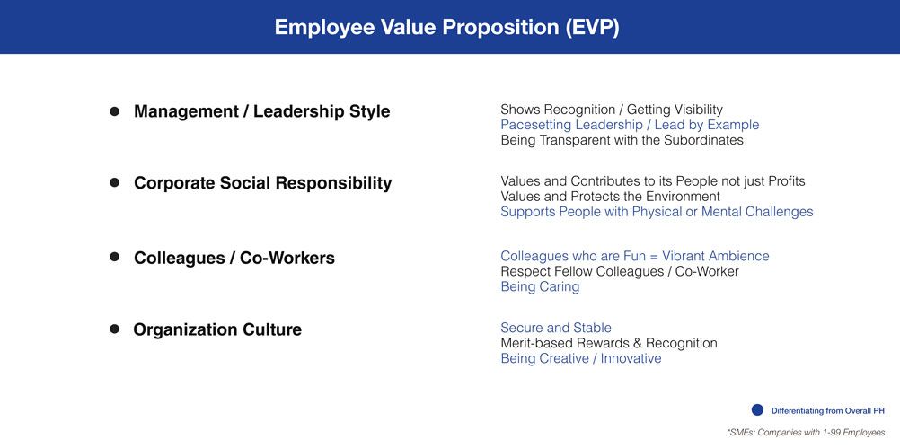 Candidates want to be assured of mandatory government benefits (Ex. SSS, Philhealth, Pagibig), medical and life insurance benefits, double pay during public holidays, and a competitive salary. Career/development programs like promotion opportunities, clear growth and succession plans, on-the-job skills and self-development programs are strong considerations for them. When it comes to work-life balance, they would choose companies that provide overtime compensation, implement public/general holidays, allow them to cash out unused annual leave or take unpaid leave, and adhere to a five-day workweek policy.
