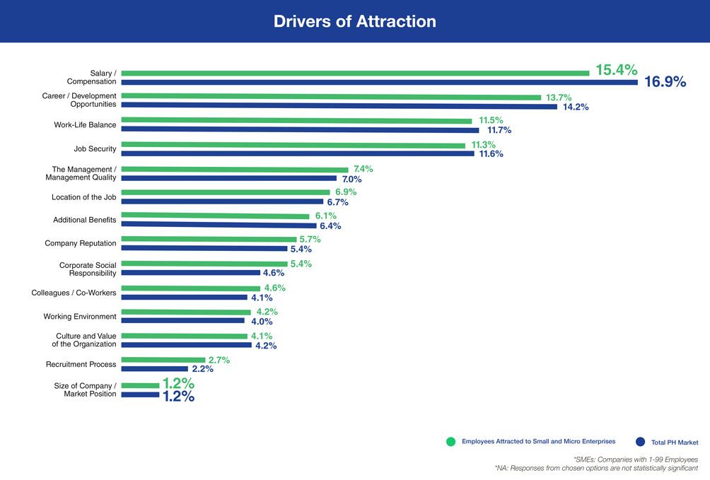 Don't let your company be defined by its size. If there is anything that would set you apart, it is the story of your brand–the values, the culture, and the people that are woven into the fabric of your organization. The Laws of Attraction’s Employment Challenge data reveal that the size or market position of a company is NOT the top priority for Filipino candidates when looking for a job. In fact, it is the least priority, and is deemed important by only 1.2% of total candidates.