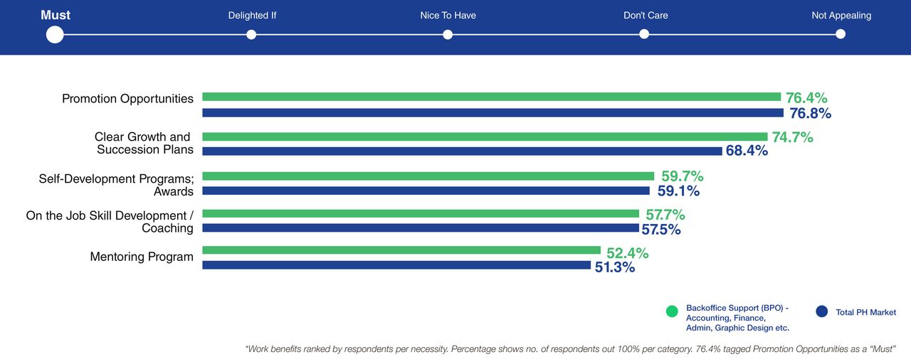 Laws of Attraction respondents believe that opportunities for promotion (76.4%), clear growth and succession plans (74.7%), self-development programs, and on-the-job skills development (57%) anchored on technology and innovation will be valuable attributes that would ensure the sustainability and growth of their careers.