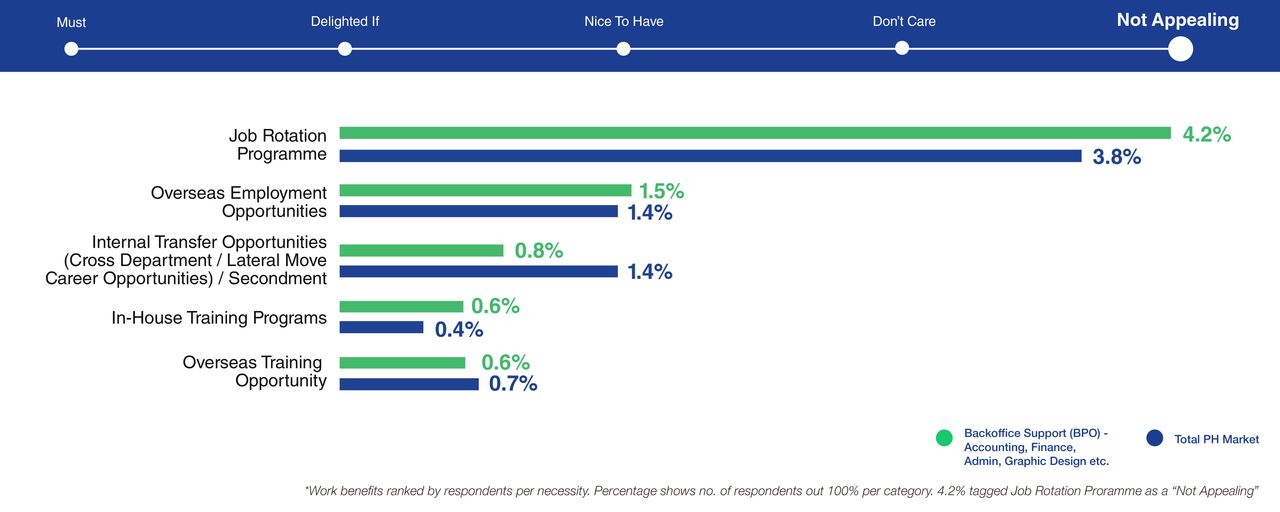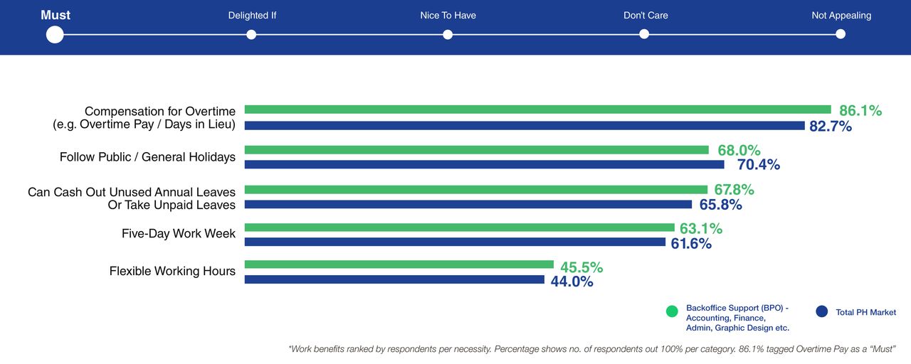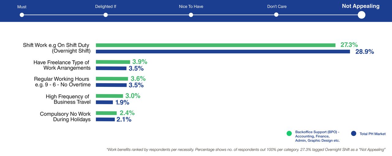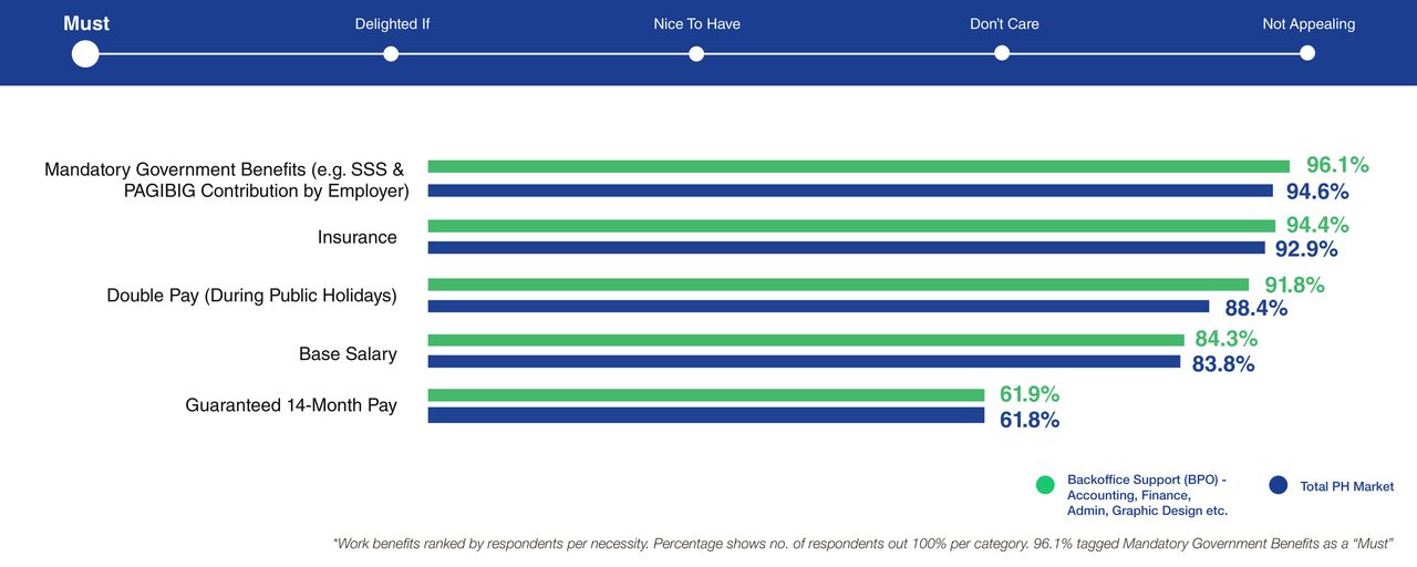 Though this is the first thing that candidates look for, money is not the end all and be all. Results in the LOA Data Lab confirm that both salary and benefits package are crucial game changers for back office professionals. Surprisingly, base salary, with its 84.3% preference, is not on the top of the list. What attracts candidates even more is the combination of employer-subsidized contribution to mandatory government benefits like SSS, PHILHEALTH, and PAGIBIG (96.1%), health insurance coverage for the employees and their family (94.4%), and double pay for working on public holidays (91%). Altogether, benefits supercede salary, but consider these as icing on the cake, your winning ticket to hitting the jackpot in your quest for talents.
