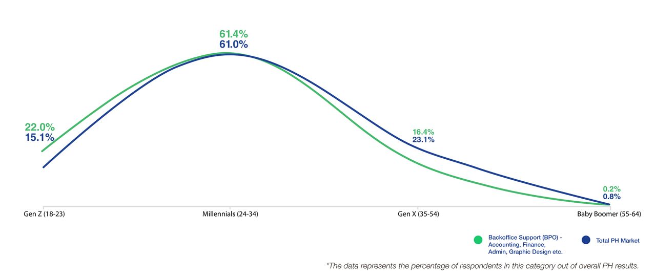The flourishing BPO ecosystem attracts mostly young professionals, consisting of 22% Gen Z (18-23 years old) and 61.4% Millennials/Gen Y (24-34 years old), a relatively younger composition than cross-industry PH market.