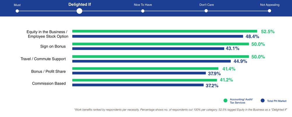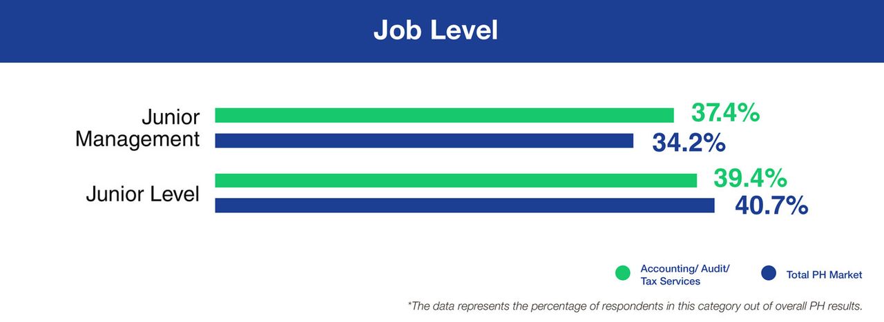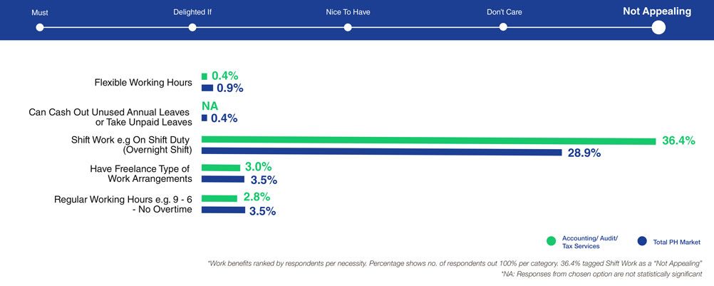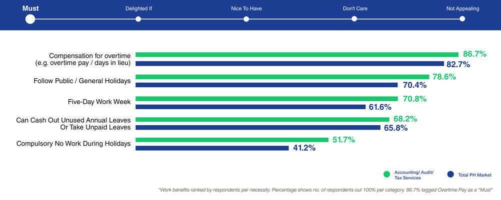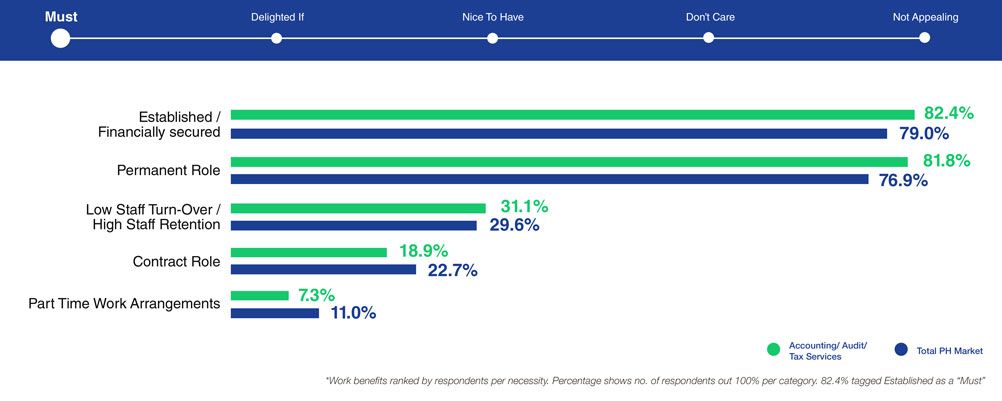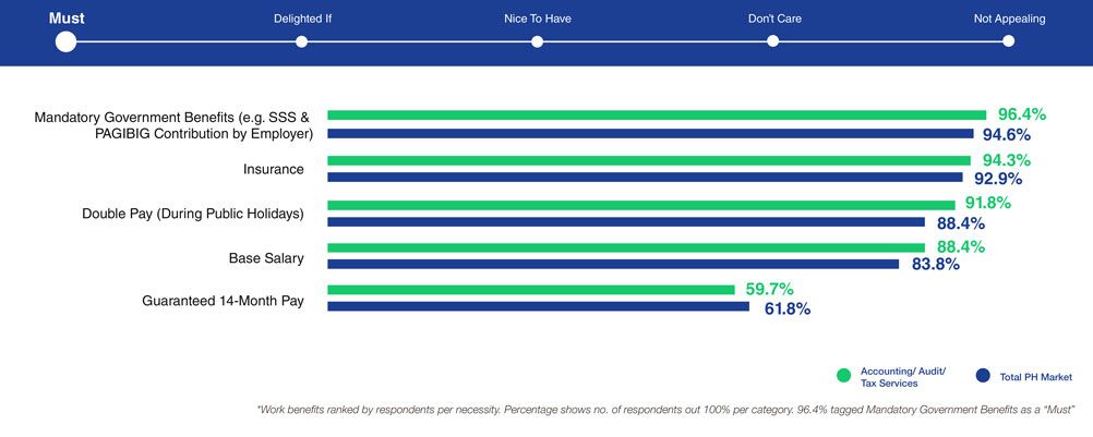 Based on LOA Data Lab's research statistics, accounting respondents prioritize salary/compensation most of all, even more than that of the total Philippine market. A surefire way to win them is by offering generous salary and benefits packages that could compete with overseas opportunities. They are looking for a generous base salary (88%) complemented with mandatory government benefits (96%), health and life insurance (93%), and double pay for public holidays (89%).