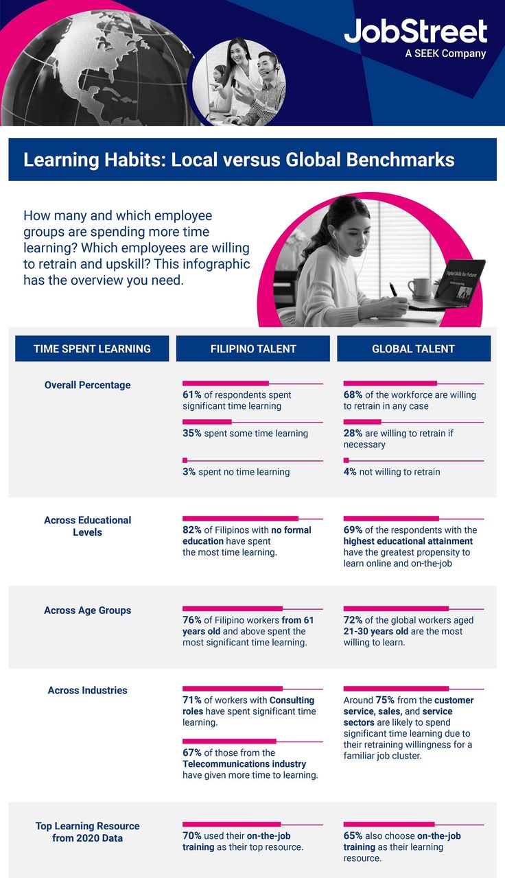 Look at some of the important findings below. The following infographic compares the learning strategies of Filipinos with that of the global workforce.