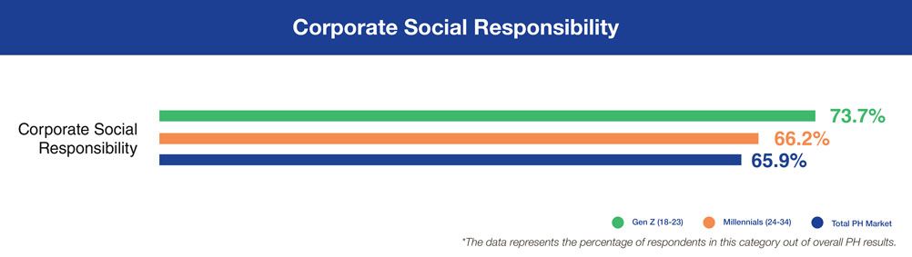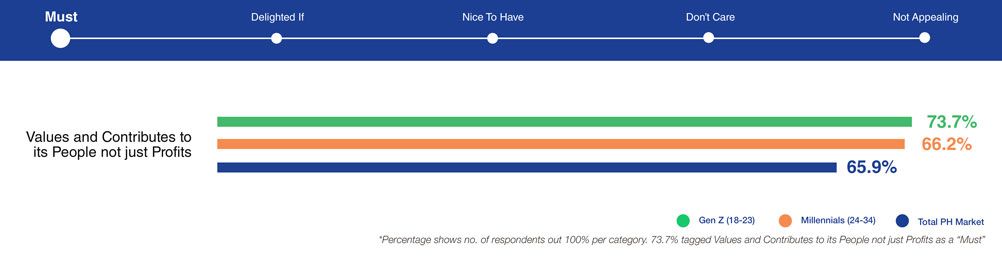 Express your care for people and community Human social responsibility was coined to encourage businesses to shift focus from the organization to its workforce and stakeholders. The comparative results on LOA Data Lab's Generations category emphasize that while Gen Z is driven by CSR more than Gen Y (6.0% versus 4.3%), both have the strongest preference for companies that value its people assets and contribute to the community. 73.7% of Gen Z respondents believe this is a "must", while 66.2% of millennial respondents share the same sentiments.