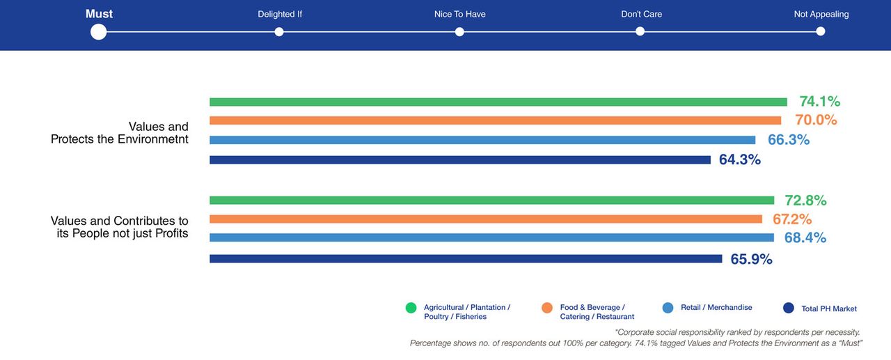Retail/merchandise, food & beverage, and agribusiness are some of the fields in which their professionals gave a high importance to CSR. They are looking for profitable companies that give high priority to the health and safety of its people, promote sustainability, and performs environment-friendly practices.