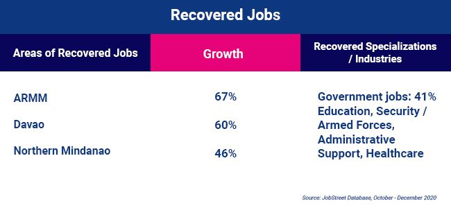 But despite the pessimistic end results, there was a slight recovery in Q3 with a 3% growth versus Q2. While Luzon and Visayas were more negatively affected, parts of Mindanao showed positive trends in their job market, specifically in ARMM (67%), Davao (60%) and Northern Mindanao (46%).