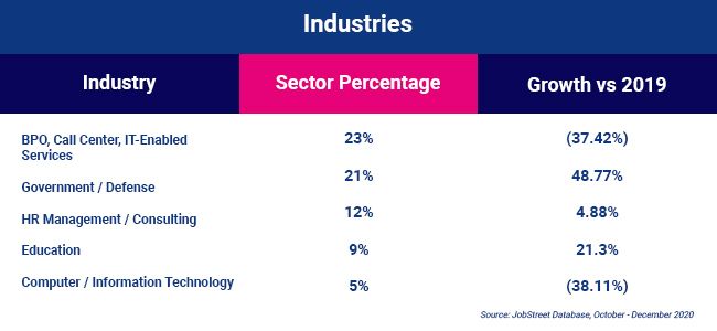 According to Jobstreet’s 2020 Q4 report, the BPO, Call Center and IT-Enabled Services sector still tops the industry list in 2020, due to the sector’s ability to handle business in a contactless manner, followed by the Government, and Human Resources Management. The decline in industry growth is reflective of the economic recession because of the pandemic.