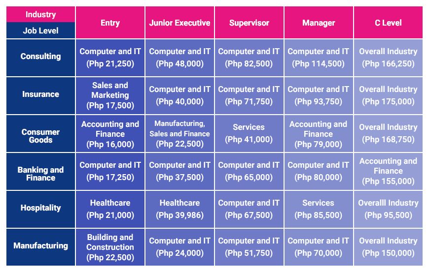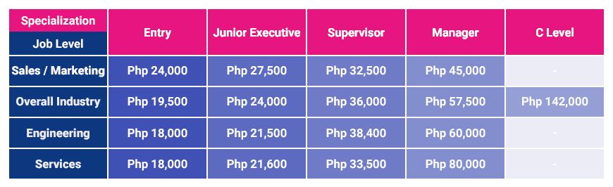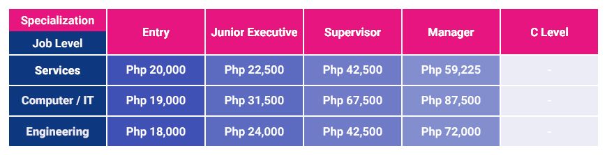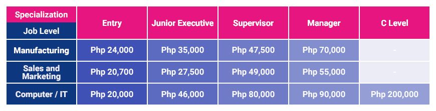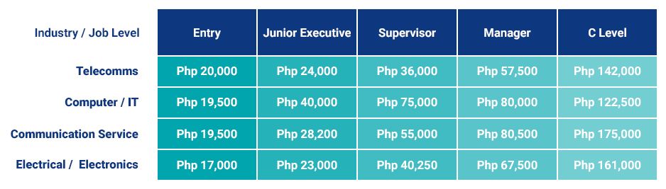 Moreover, computer and information technology (IT) companies show competitive salaries for junior executive, supervisor, and managerial levels. They are Php 47,500, Php 85,000, and Php 100,000, respectively.