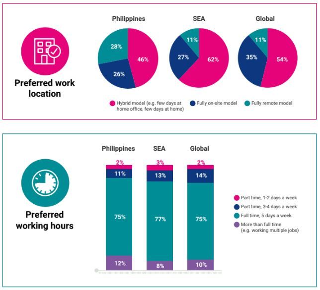 Preferred work location In the Philippines, most employees preferred a hybrid model. Meaning, they want the option to work a few days in the office. Then, the rest of the week will be spent working from home. The same is true from a Southeast Asia and global level, where more than half of the respondents agreed on a hybrid workplace as the best option.