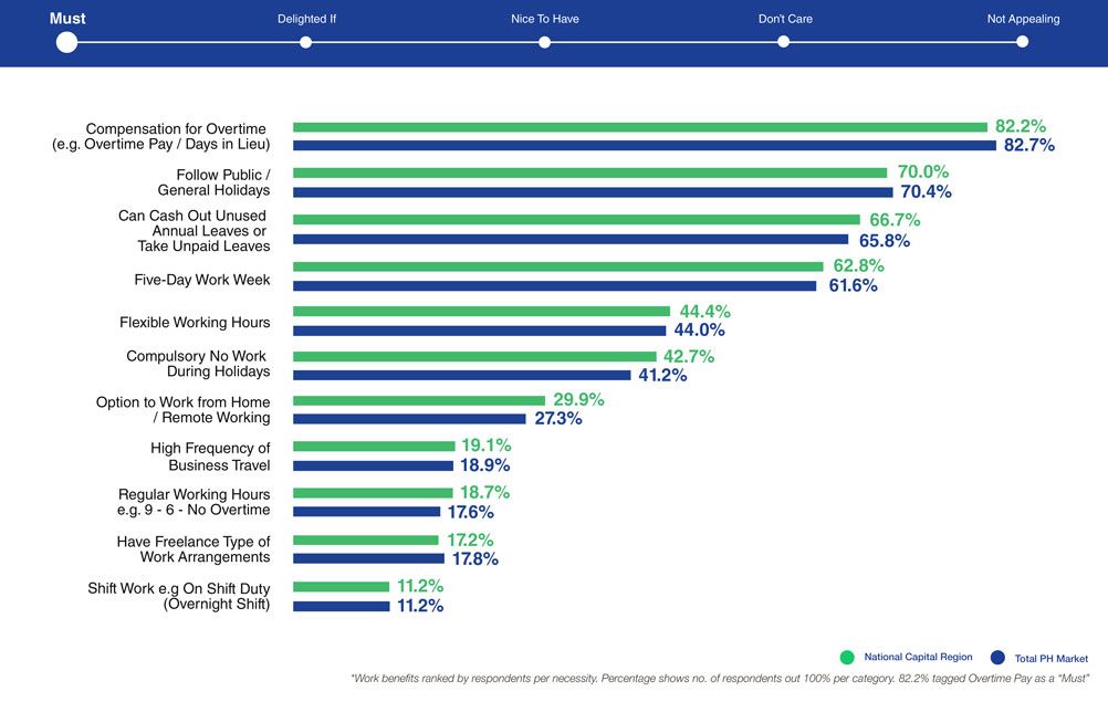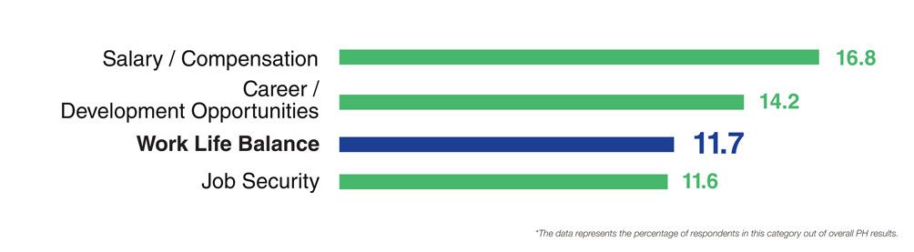 The least important factors for Filipino talents under work-life balance are: shift work, freelance type of work arrangements, and regular working hours. In other words, most employees don’t find overnight shifts appealing.