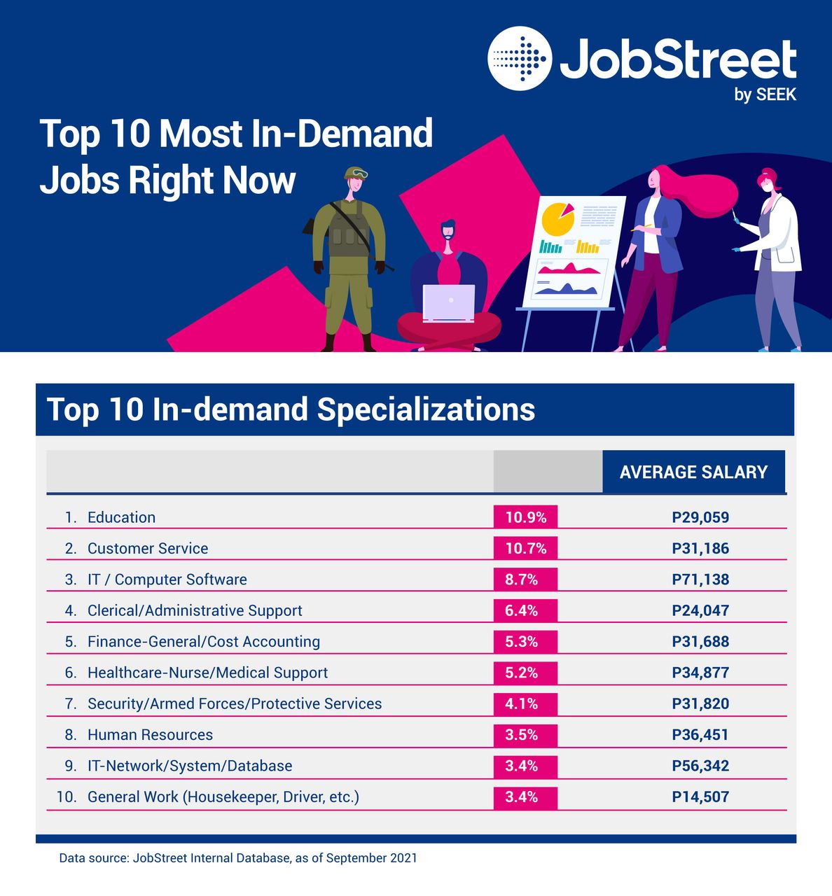 Despite these hurdles, some local industries manage to thrive, creating job opportunities. Based on Jobstreet Data, here are the Top 10 in-demand jobs this year as of September 2021 and their corresponding average monthly salary.