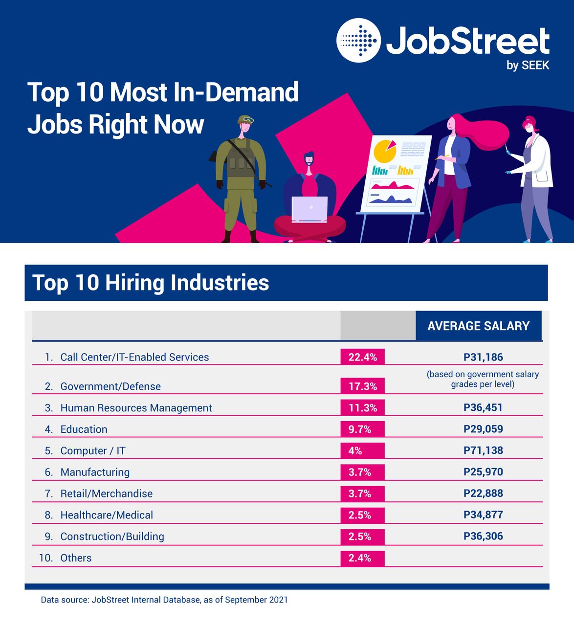 As of September 2021, here are the top industries hiring based on the job ads posted on Jobstreet this year: