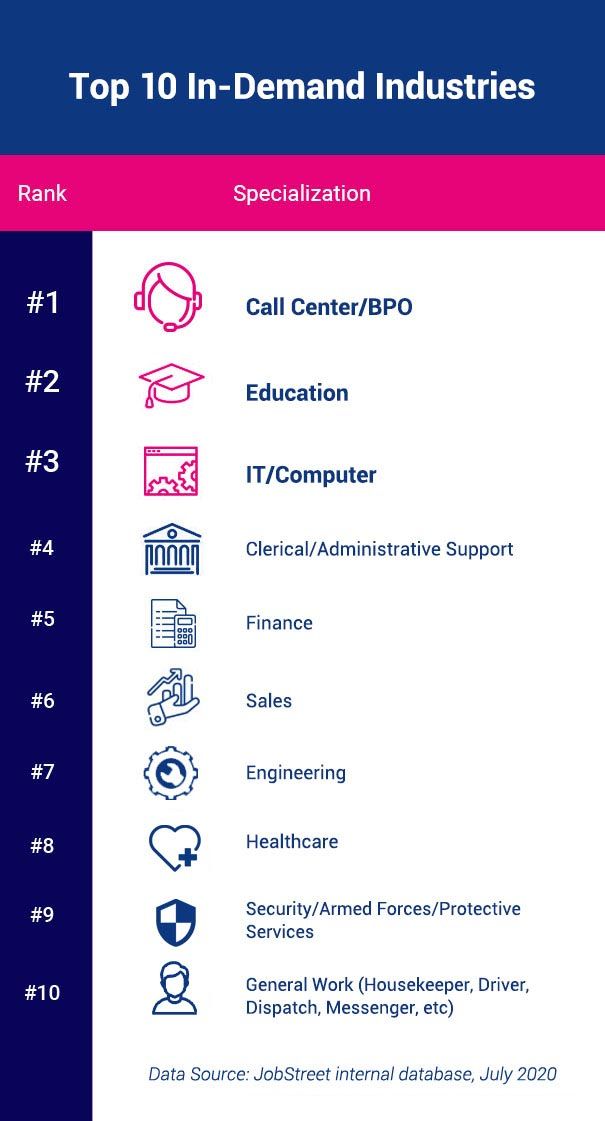 Despite the need for health care workers, a decrease in demand is observed in the Philippines. This is contrast from the early months of community quarantine, where Healthcare placed 3rd on the list. The descent of Healthcare industry to 8th place can be attributed to the general slump of the current job market, where unemployment has reached record rates. As non-critical patients are avoiding going to hospitals for their usual checkups and medical tests, profit has been generally down. Hospitals and other medical institutions still rely on other non-healthcare roles in Finance, Admin and IT, and smaller hospitals are struggling to maintain operations. This puts a damp in hiring budgets even if the demand for healthcare is higher than ever.