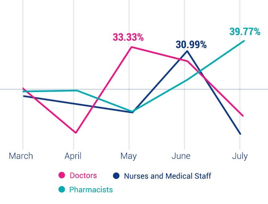 As the chart below shows, a pattern is observed wherein we see that the demand in doctors spiked first, followed by nurses. Right now, the trend shows that there is an increased demand for Pharmacists.